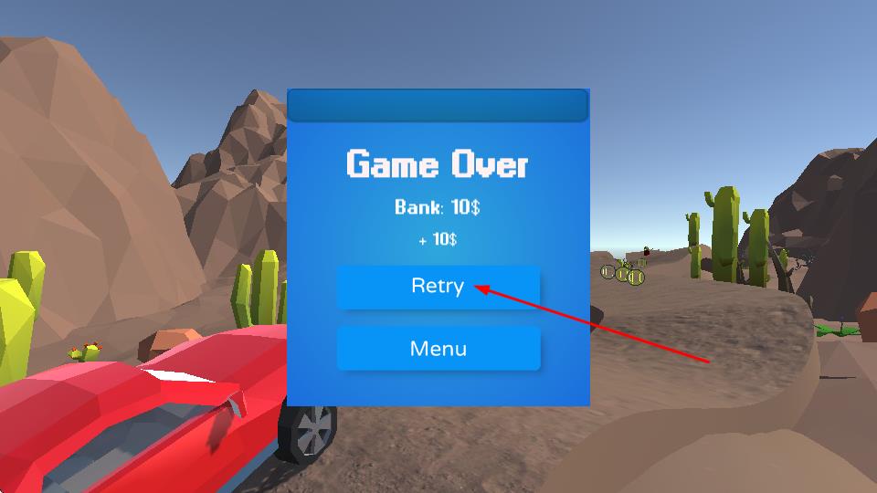 3、若車(chē)輛無(wú)法前行或燃油耗盡,觸發(fā)Game Over界面,點(diǎn)擊Retry重新挑戰(zhàn),或選Menu返回主菜單,金幣可用于商店升級(jí)車(chē)輛。