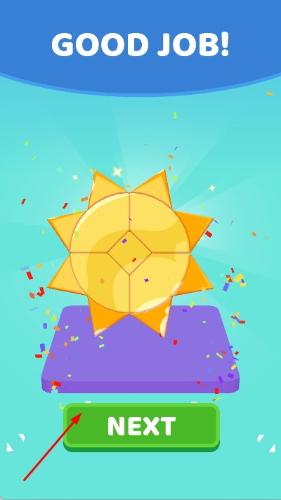 3、上方進(jìn)度條會(huì)顯示完成進(jìn)度,成功拼完當(dāng)前關(guān)卡形狀,點(diǎn)擊NEXT進(jìn)入下一關(guān)。