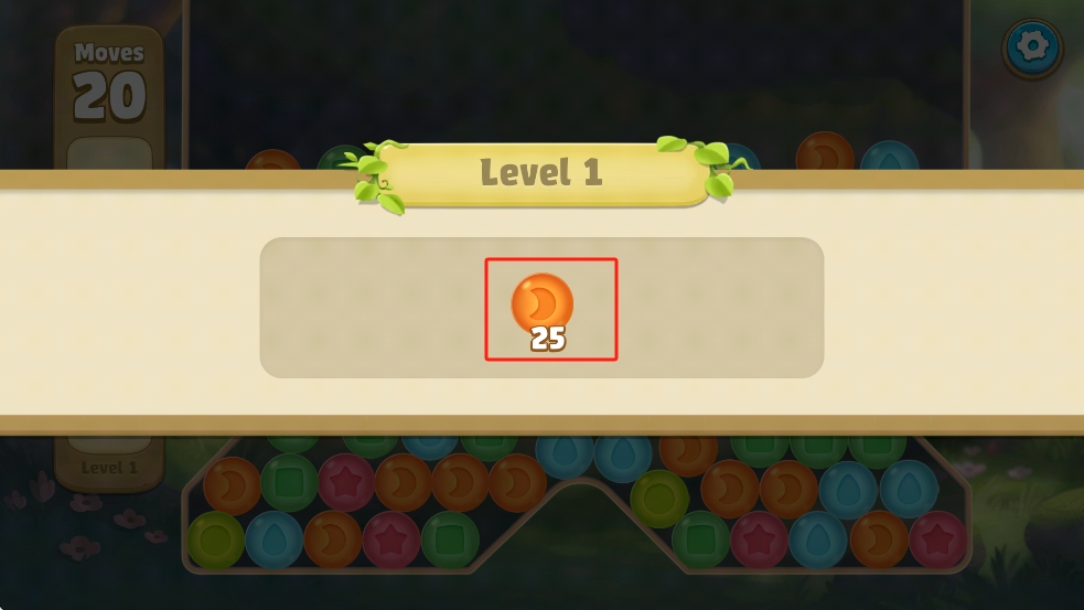 1、打開作品后界面顯示需收集25個橙色月牙形,觀察下方的布局,優(yōu)先找同色的進行消除,規(guī)劃消除路徑。