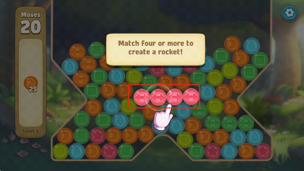2、按提示匹配4個及以上顏色相同的圓球,可以觸發(fā)火箭特效,快速消除周圍圓球,助力收集目標橙色圓球。