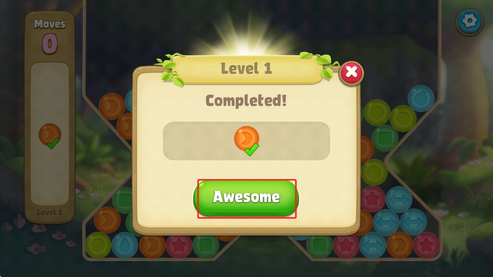 3、完成收集25個橙色月牙形圓球的任務后,點擊綠色的Awesome按鈕,即可前往下一關開啟新的挑戰(zhàn)。