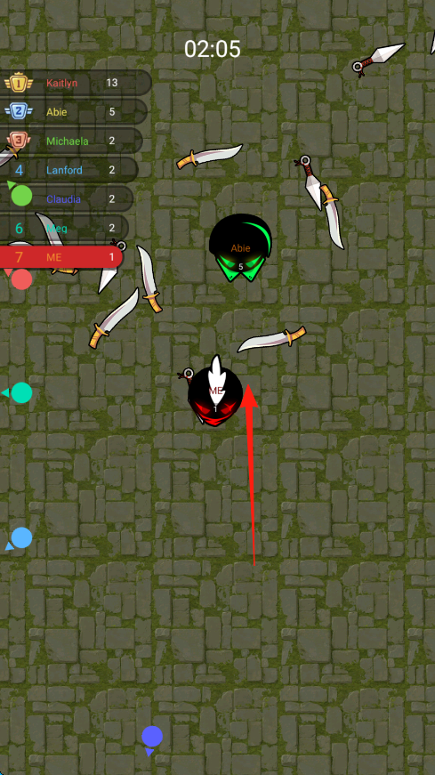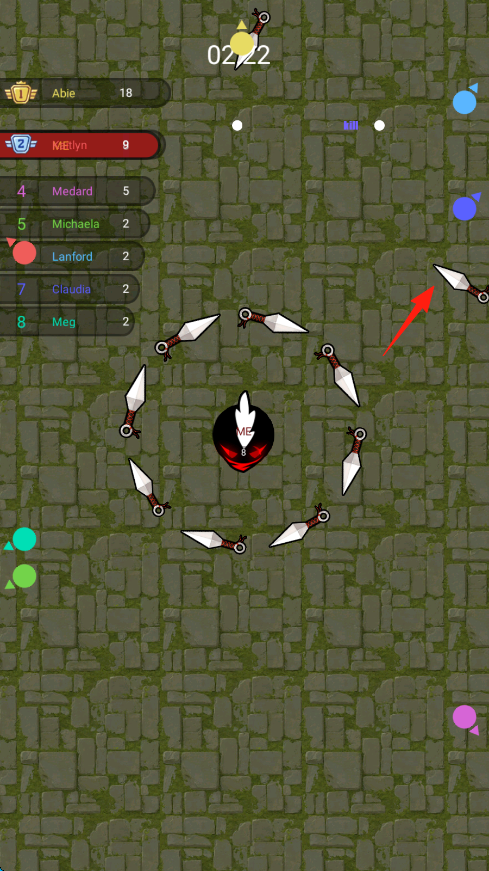1、控制ME角色紅黑頭像,利用周圍飛刀,按箭頭指引方向移動、攻擊其他玩家如Abie。