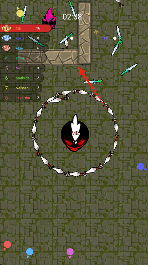 3、沿箭頭找敵人,借助地形石墻躲避,積累飛刀數(shù)量,優(yōu)先攻擊弱小目標,提升排名。