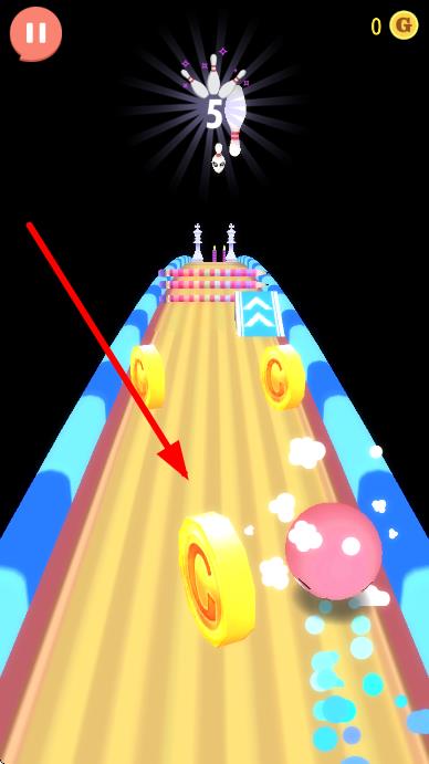 3、引導(dǎo)保齡球滾動(dòng)經(jīng)過(guò)黃色硬幣標(biāo)識(shí),收集硬幣,同時(shí)注意避開或利用場(chǎng)景中的其他元素。