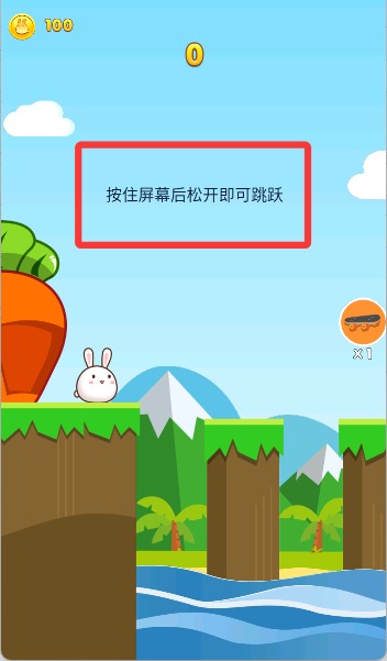1、進入游戲后,通過點擊任意位置控制小兔子的跳躍,目標是不斷前行,安全避開各種障礙與陷阱。