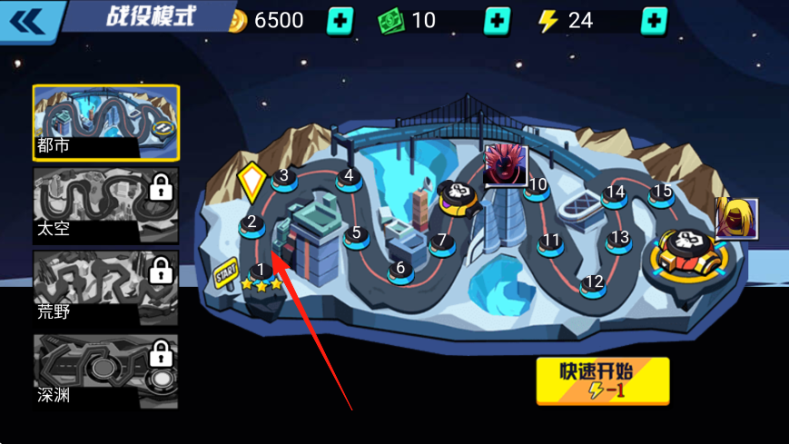 1、在戰(zhàn)役模式中選擇都市地圖、點擊關卡點如1、確認后進入戰(zhàn)斗準備狀態(tài)為對戰(zhàn)做鋪墊。