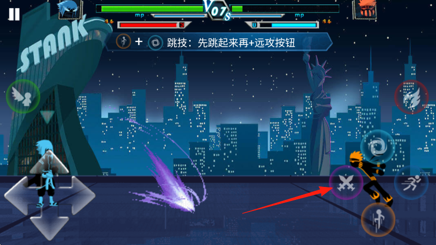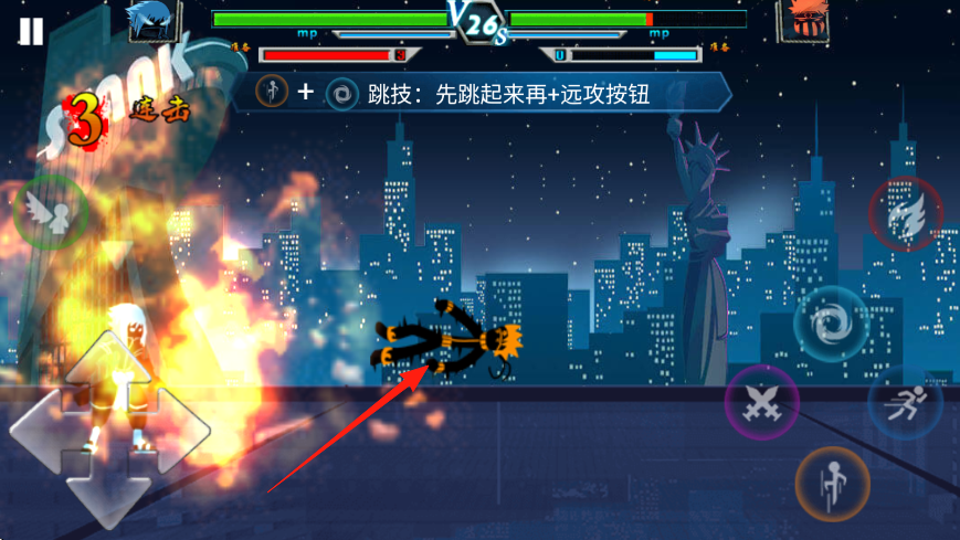 3、按提示先跳再遠攻使用跳技、觸發(fā)3連擊消耗敵方血條、持續(xù)攻擊直至擊敗對手贏得勝利。