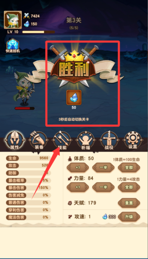 3、每過(guò)一關(guān)記得領(lǐng)取資源,用來(lái)升級(jí)角色等級(jí)和解鎖新天賦,合理分配點(diǎn)數(shù)能讓?xiě)?zhàn)力穩(wěn)步提升輕松應(yīng)對(duì)后期。