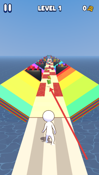 1、操控角色沿彩色跑道前進(jìn),拾取路上的彈簧道具,提升跳躍能力,借此躲避兩側(cè)的障礙,推進(jìn)關(guān)卡進(jìn)程。