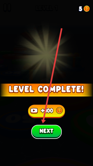 3、關(guān)卡完成后,點(diǎn)擊綠色NEXT按鈕,領(lǐng)取100金幣獎(jiǎng)勵(lì),隨即進(jìn)入下一關(guān),開啟新的挑戰(zhàn)之旅。