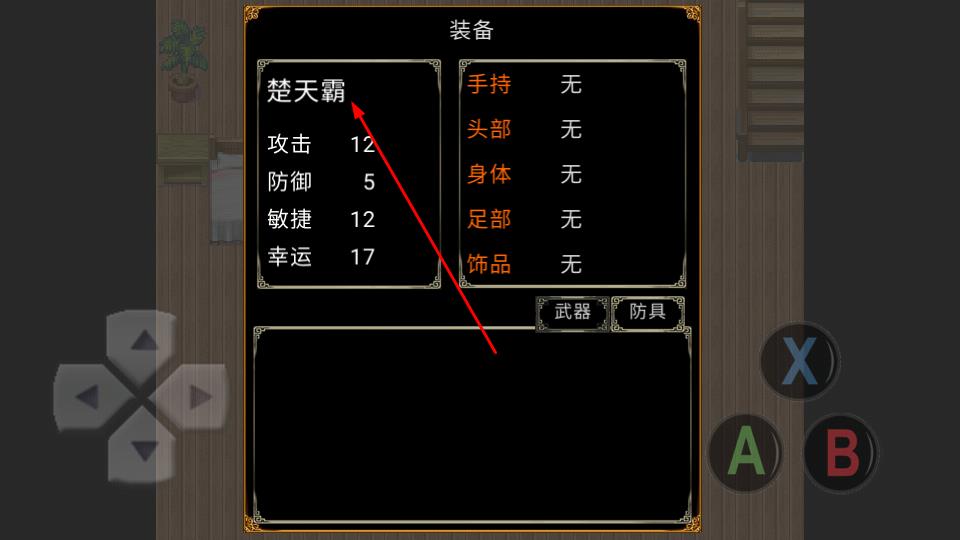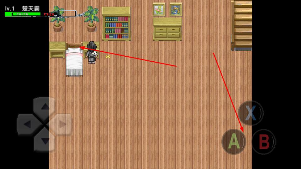1、操控角色楚天霸在房間移動,點(diǎn)擊右側(cè)A鍵呼出功能菜單,包含背包、裝備等選項(xiàng),開啟界面交互流程。