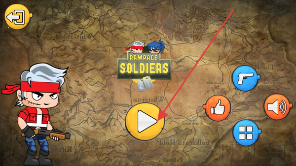 1、進(jìn)入RAMPAGE SOLDIERS游戲地圖界面,點(diǎn)擊黃色播放按鈕,可開啟游戲,進(jìn)入角色選擇等后續(xù)環(huán)節(jié)。
