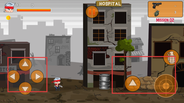 3、戰(zhàn)斗時(shí),左側(cè)紅框內(nèi)按鈕控制角色移動(dòng)方向,右側(cè)紅框按鈕控制跳躍、攻擊等,利用這些操作在關(guān)卡中消滅敵人,完成任務(wù)。