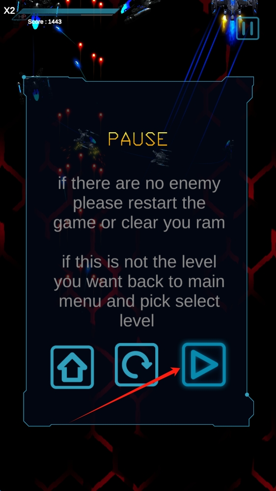 3、暫停界面,點(diǎn)擊播放鍵繼續(xù)戰(zhàn)斗;若遇問題,可返回主菜單或重置關(guān)卡,重新挑戰(zhàn)。