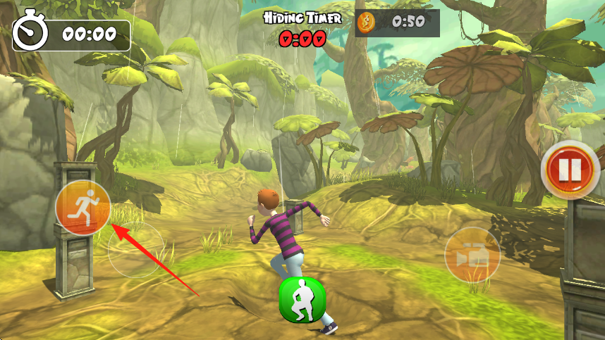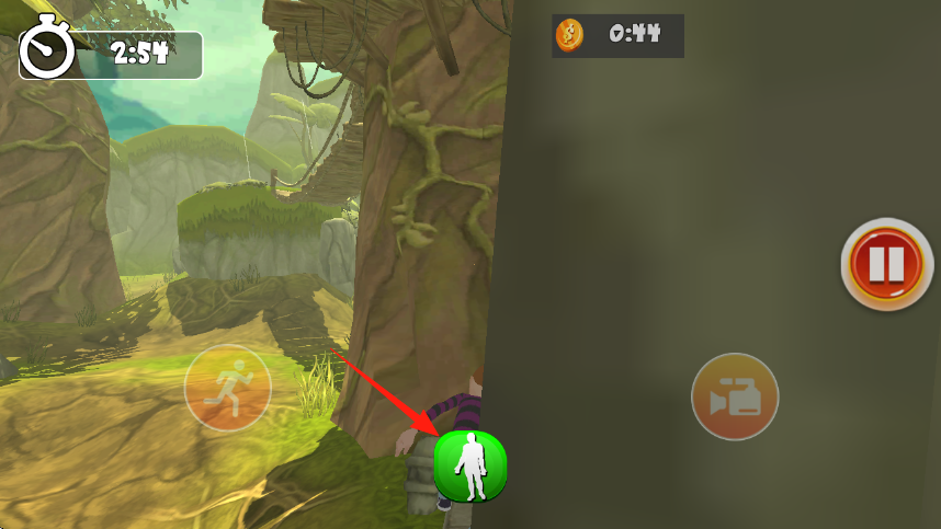 1、點擊左側(cè)橙色跑步按鈕,操控角色在叢林奔跑,利用場景躲避,注意上方計時,推進(jìn)游戲。