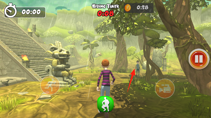 3、靠近樹木時,點擊綠色隱藏按鈕,讓角色藏于場景,利用環(huán)境躲避,關(guān)注計時與金幣,達(dá)成隱藏目標(biāo)。