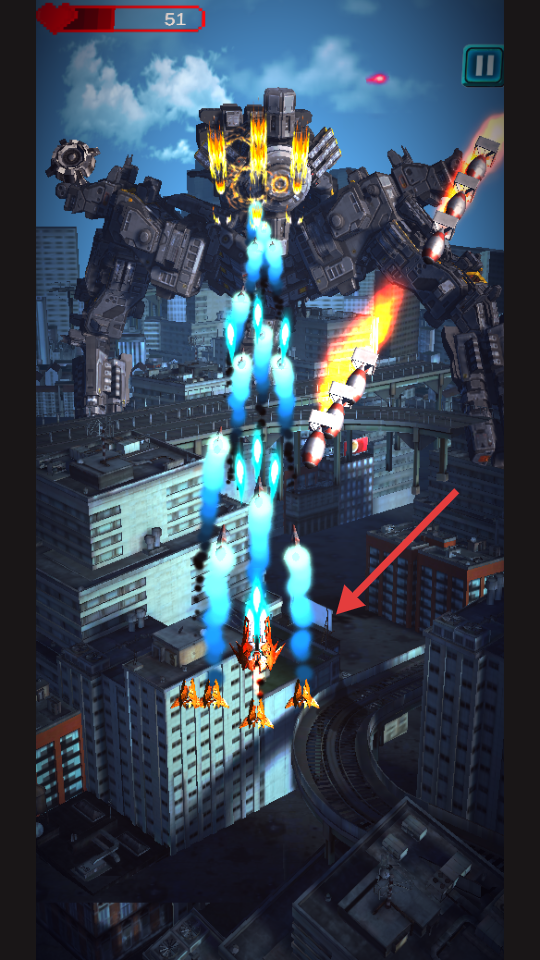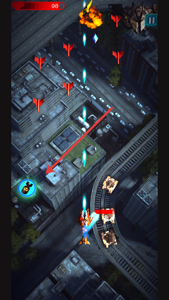 1、滑動(dòng)屏幕控制戰(zhàn)機(jī)移動(dòng),自動(dòng)攻擊范圍內(nèi)敵人。