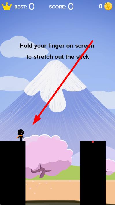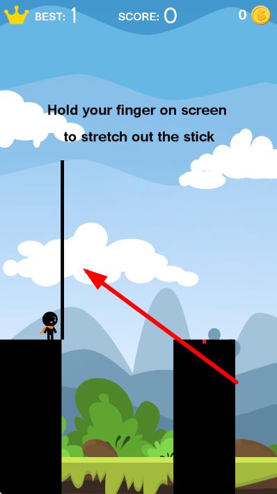 1、進(jìn)入關(guān)卡,操控小黑人站在懸崖一端,前方是懸空的另一端,準(zhǔn)備按住屏幕讓木板開始伸長(zhǎng)。