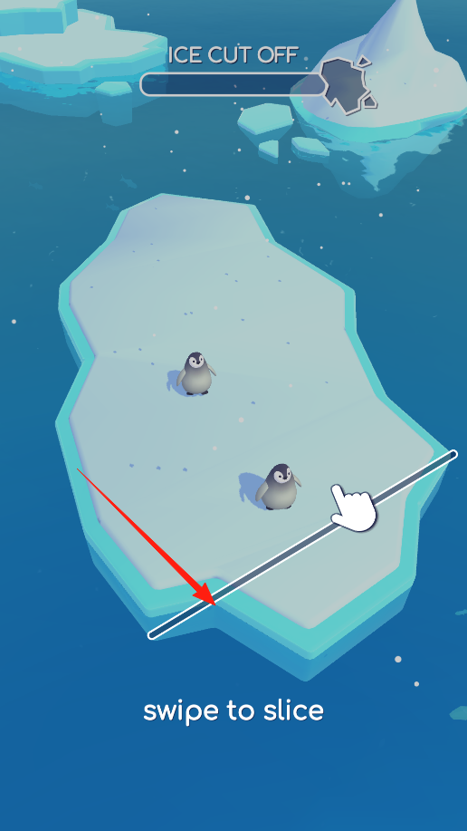 2、按照提示swipe to slice,用手指滑動(dòng)屏幕切割冰塊,切割時(shí)注意路線,要讓企鵝所在的冰塊區(qū)域保持安全,別讓它們掉海里,通過切割調(diào)整冰塊形態(tài)。