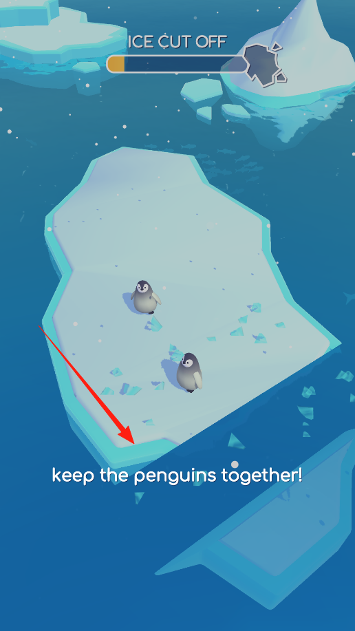 3、切割完冰塊后,看提示keep the penguins together,得保證兩只企鵝留在同一塊安全冰塊上,后續(xù)繼續(xù)切割或調(diào)整,讓它們不分離,成功完成救援,進(jìn)入下一關(guān)。