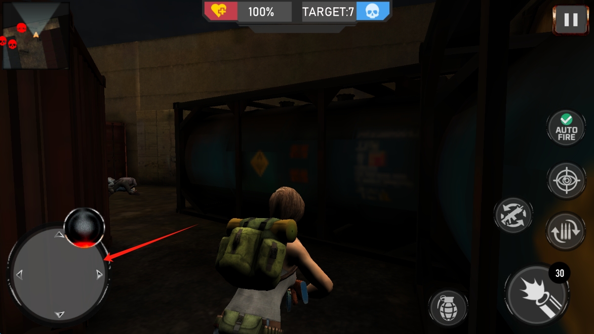 2、游戲中,滑動虛擬搖桿移動角色,利用掩體,接近敵人區(qū)域,撥動輪盤移動人物。