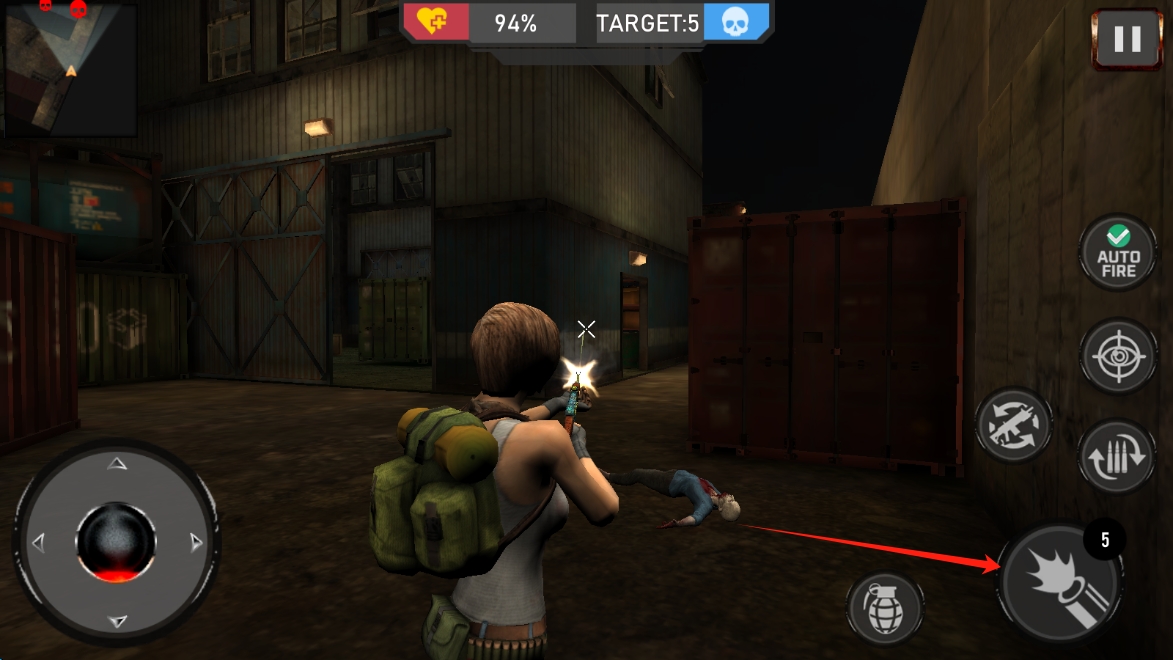 3、點擊射擊按鈕,精準打擊敵人,完成TARGET消滅目標,推進關卡,點擊射擊敵人。