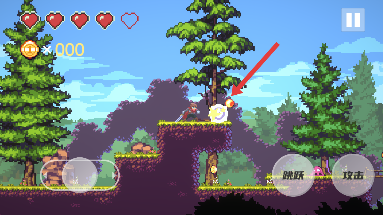 2、利用跳躍的按鍵跨越地形落差,需要注意下方怪物與金幣,規(guī)劃角色移動(dòng)路徑拾取金幣,消滅敵人。