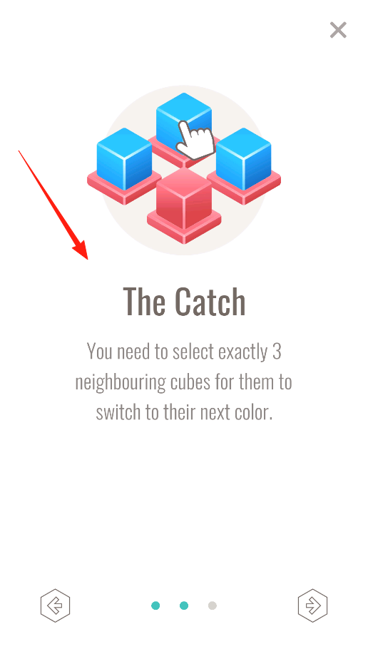 2、接著看The Catch規(guī)則,得選正好3個相鄰方塊,它們才會切換顏色,玩的時候,找相鄰的三個方塊,點選它們讓顏色變化,靠這操作調(diào)整方塊顏色,往目標配色靠近。