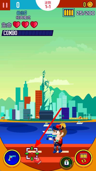 2、在經(jīng)典模式戰(zhàn)斗界面,依據(jù)箭頭提示,點擊下方瞄準區(qū)域,調(diào)整射擊準星,對準目標進行射擊,利用槍械消滅敵人。