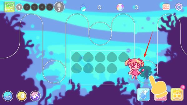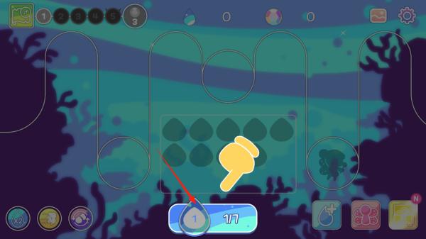 2、進(jìn)入關(guān)卡有軌道和水滴道具,按提示點(diǎn)擊水滴圖標(biāo),把水滴放到軌道上,讓精靈沿著軌道移動(dòng),收集更多水滴,完成7個(gè)水滴收集目標(biāo),推進(jìn)關(guān)卡進(jìn)度。