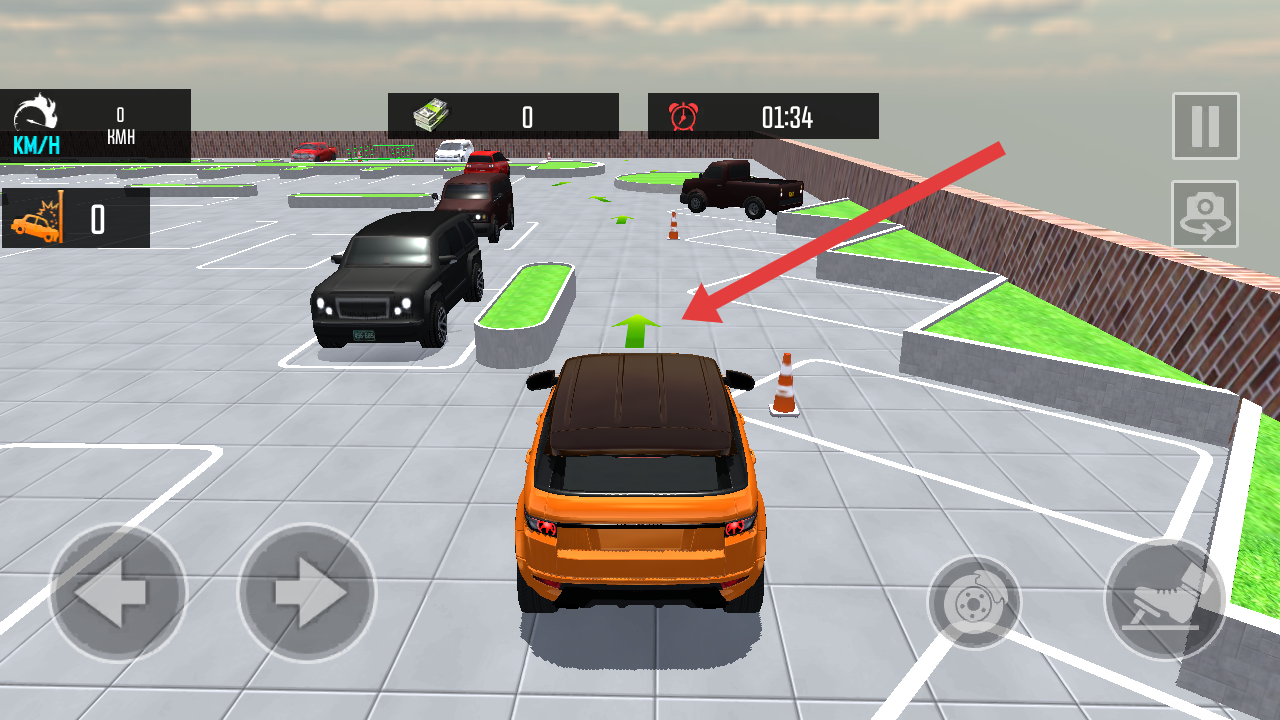 2、操控車輛時(shí),跟隨畫面中綠色箭頭指示的方向行駛,注意避讓周圍停放的車輛與路錐,通過虛擬按鍵控制車速和轉(zhuǎn)向。