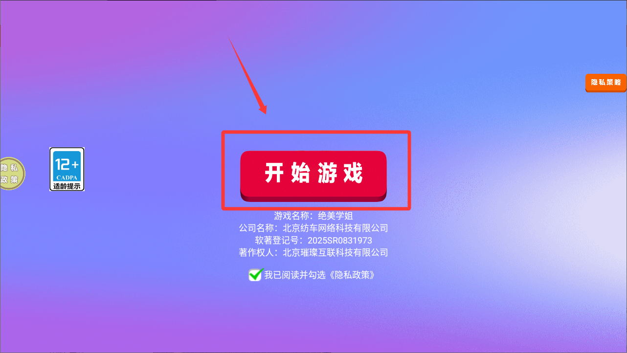 1、點(diǎn)擊紅色框框開(kāi)始游戲文字按鈕進(jìn)入。