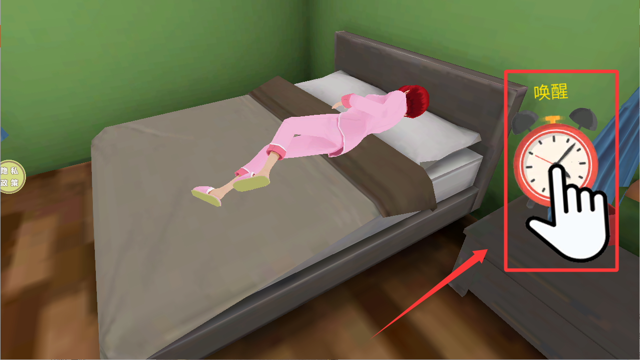 4、按一下右邊的鬧鐘叫醒她起床吃早餐上學(xué)。