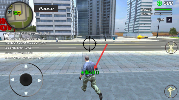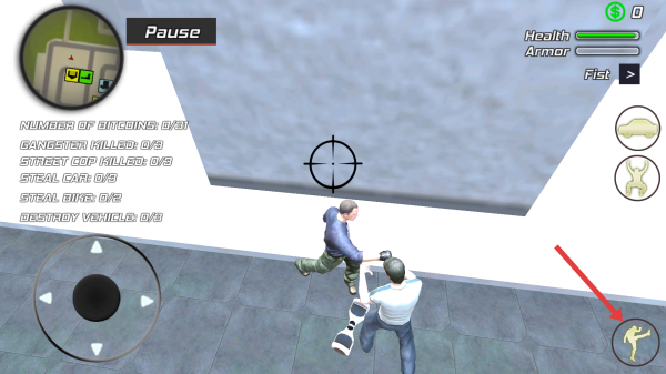 1、用左側(cè)搖桿移動(dòng)角色,靠近目標(biāo)如敵人等,右側(cè)拳打腳踢按鈕攻擊,優(yōu)先擊殺匪徒完成計(jì)數(shù)。