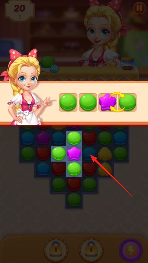 1、這是消除關(guān)卡,按上方提示,把對應(yīng)顏色和形狀的馬卡龍移動交換位置,像箭頭指的,讓綠色和紫色馬卡龍湊一起,三個及以上同色就能消除,完成目標(biāo)。