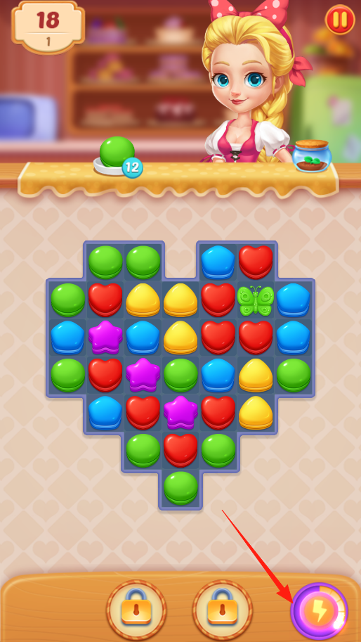 2、消除過程中,下方有閃電道具,攢夠能量,點(diǎn)閃電道具,它會幫你消除一片馬卡龍,快速推進(jìn)關(guān)卡,合理用道具,能更輕松完成消除任務(wù),拿到高分。