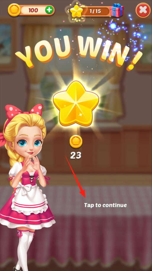 3、通關(guān)后,出現(xiàn)YOU WIN界面,有星星和金幣獎勵,點(diǎn)Tap to continue繼續(xù)下一關(guān),挑戰(zhàn)更難的消除,贏更多獎勵,解鎖新內(nèi)容。