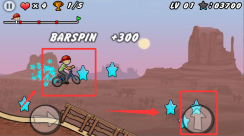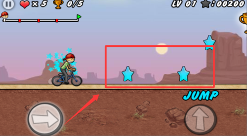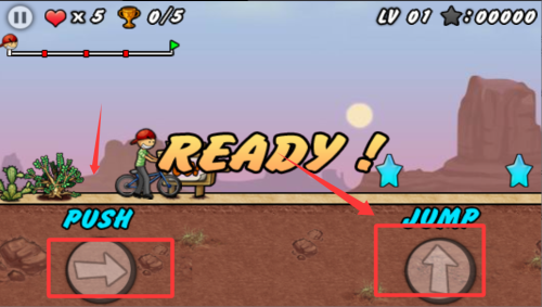 1、開始游戲后,用左下方按鈕控制加速,右下方按鈕負責(zé)跳躍,通過兩個按鍵配合讓單車順利前進。