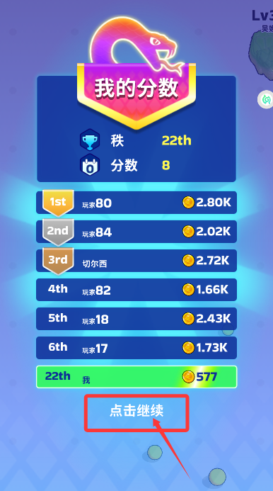 3、對戰(zhàn)結(jié)束彈出成績單,查看最終名次與得分后可點擊繼續(xù)挑戰(zhàn)。