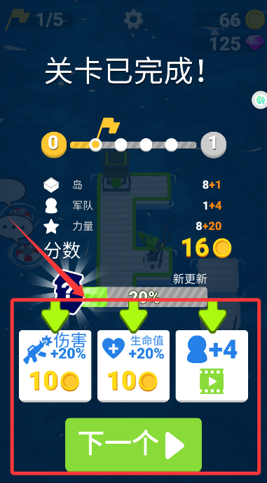 4、順利擊敗敵人后彈出戰(zhàn)績(jī)面板,可強(qiáng)化攻擊力或生命值等屬性。