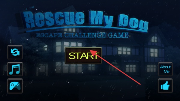 1、進入Rescue My Dog游戲,點擊START按鈕,開啟救援狗狗的密室逃脫挑戰(zhàn),身處雨夜房屋場景,準備解謎。
