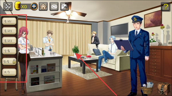 2、在客廳場景,左側有房間庫101、庫102等及倉庫、廚房、大廳選項,按箭頭指引探索房間,與角色互動,尋找救援線索。