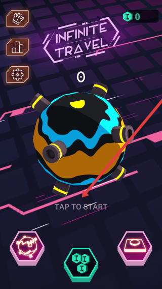 1、點擊TAP-TO-START”,進入Infinite-Travel游戲,操控球形角色開啟穿梭挑戰(zhàn),初始界面功能按鈕可后續(xù)探索,先聚焦啟動游戲。