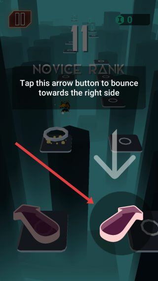 2、新手階段跟隨提示,點擊右側(cè)箭頭按鈕,讓角色向右側(cè)彈跳,借助平臺推進,熟悉操作邏輯,逐步提升跳躍節(jié)奏,應對Novice-Rank關卡考驗。
