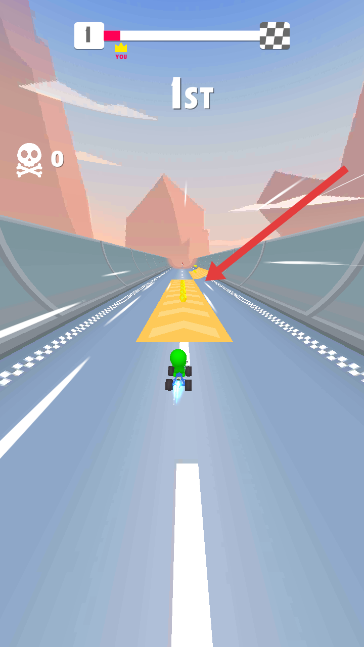 1、駕駛賽車沿著黃色的加速帶行駛,收集路徑上的金幣,借助加速效果提升車速,鞏固領(lǐng)先位置。