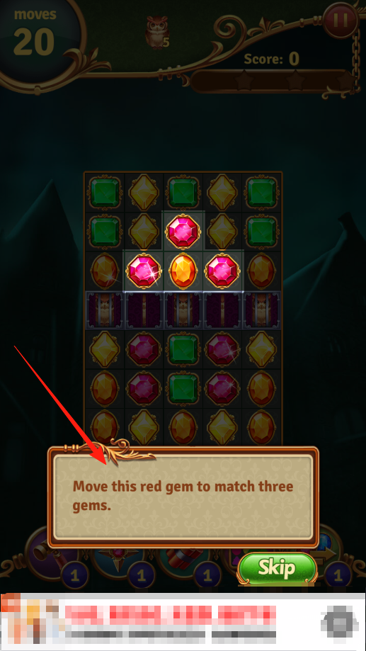 1、進入寶石消除關卡,提示要移動紅寶石湊三個,找到指定紅寶石,按住拖到旁邊,和另外兩個紅的排成一排,消除后得分,用20步完成目標。