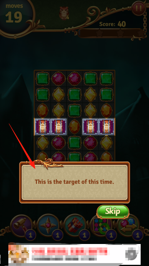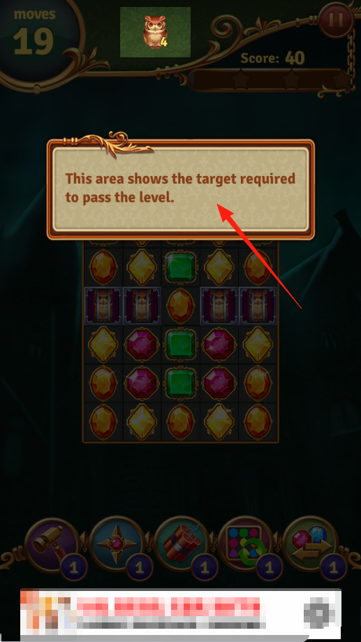 2、消除后,出現(xiàn)新提示,說這是當前目標,看箭頭指的帶圖案方塊,得想辦法把它們湊一起,通過交換寶石位置,讓目標方塊連起來,每步都算在19步里。