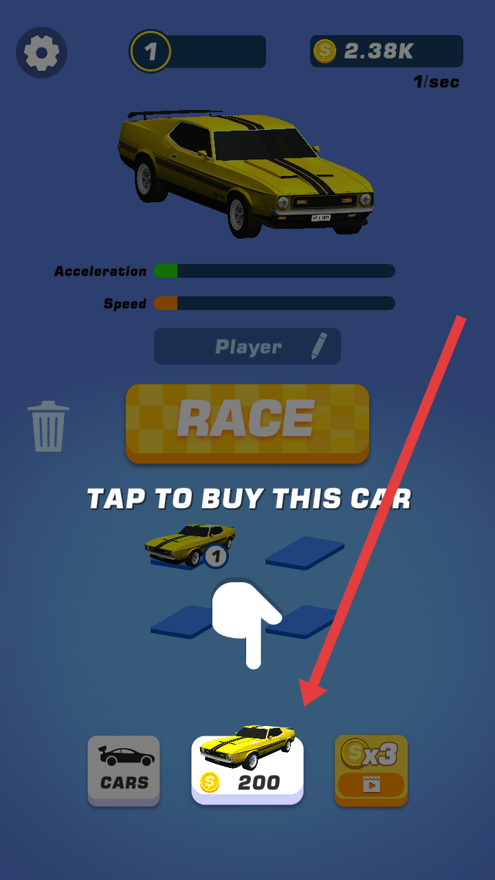 1、在車輛界面,點擊底部標(biāo)有200金幣的黃色汽車圖標(biāo),消耗金幣購買該車輛,擴充車庫的庫存。
