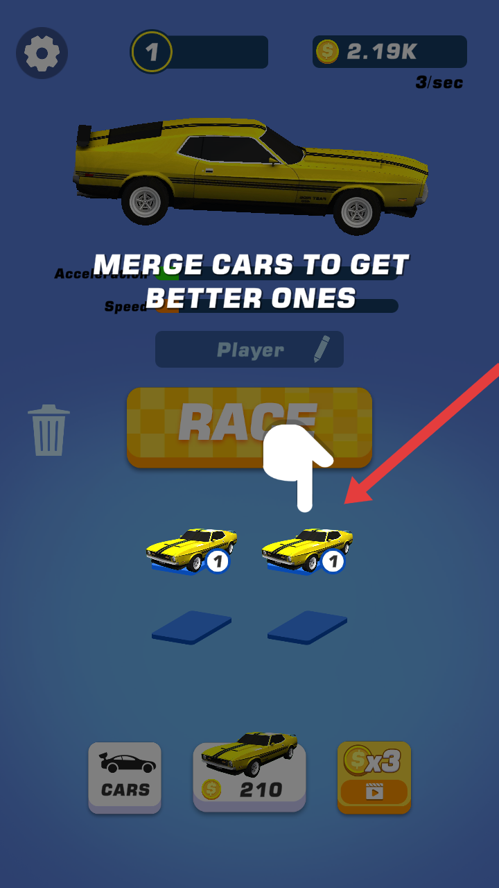 2、將兩輛相同的黃色汽車拖至同一空位,遵循MERGE CARS TO GET BETTER ONES的規(guī)則,合成更高級車輛。