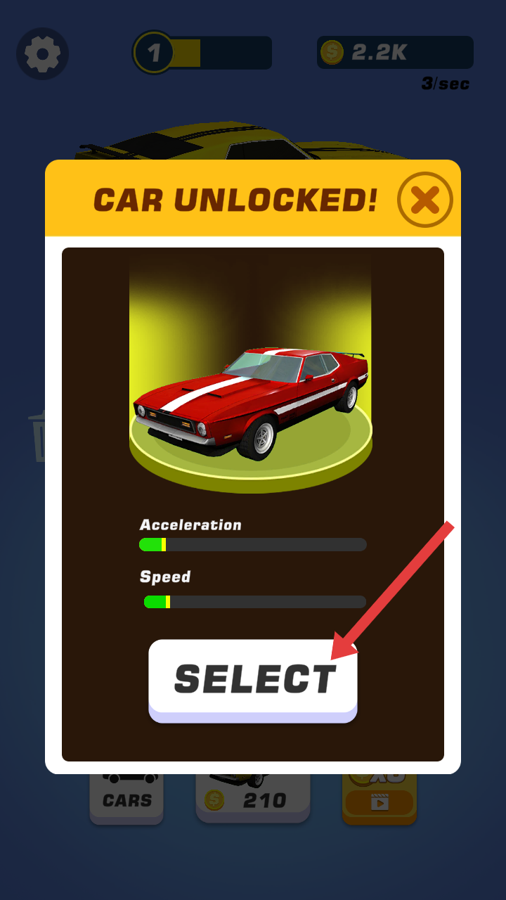 3、解鎖紅色新車輛后,點擊彈窗內(nèi)的SELECT按鈕,選定這個新車作為參賽的車輛,提升競速性能。